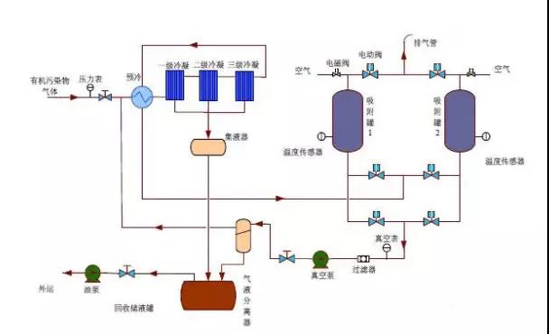 該技術(shù)采用多級(jí)冷凝技術(shù),使廢氣的有機(jī)成分在常壓下凝結(jié)成液體析出,經(jīng)凈化后的廢氣進(jìn)入吸附器進(jìn)一步吸附富集,同時(shí)確保達(dá)標(biāo)排放。吸附飽和后的吸附劑(活性炭、沸石等)等采用負(fù)壓脫附方式再生吸附劑,并將高濃度 VOCs 送回前端冷凝裝置。