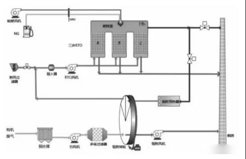 沸石轉(zhuǎn)輪吸附濃縮+蓄熱式燃燒工藝流程示意圖