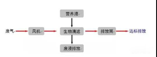 工藝流程以生物氧化為主、化學(xué)吸收為輔,主要通過生物處理去除廢氣中的絕大部分污染物,化學(xué)吸收單元?jiǎng)t可在進(jìn)氣濃度發(fā)生異常時(shí),為系統(tǒng)的穩(wěn)定達(dá)標(biāo)排放提供進(jìn)一步保證。主體技術(shù)生物滴濾箱由濾床、營(yíng)養(yǎng)液循環(huán)噴淋系統(tǒng)、參數(shù)控制系統(tǒng)等組成。廢氣進(jìn)入生物箱體后,通過附著在填料上的微生物的代謝作用,廢氣中的污染物被降解為簡(jiǎn)單的無機(jī)物。其中,VOCs分解為CO2、H2O以及其他簡(jiǎn)單的無機(jī)物;含氮污染物中的氮元素轉(zhuǎn)化為硝酸鹽或氮?dú)?;含硫惡臭污染物中的硫元素轉(zhuǎn)化為硫酸鹽。