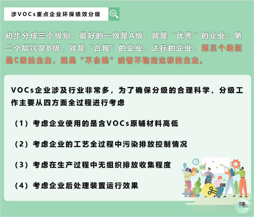 工業(yè)企業(yè)VOCs排放包括有組織排放和無組織排放兩種形式,當(dāng)企業(yè)VOCs無組織排放嚴(yán)重時,不僅無法有效處理有機(jī)廢氣,而且造成有組織廢氣中VOCs排放濃度和排放速率偏低,無法形成有效監(jiān)督管理。 但現(xiàn)有實(shí)施的VOCs排放控制標(biāo)準(zhǔn)無法對企業(yè)VOCs無組織排放進(jìn)行有效控制。 還需要廣大涉VOCs無組織排放企業(yè)從原輔材料清潔化替代、VOCs無組織排放管控、建設(shè)適宜高效污染治理設(shè)施和建立健全臺賬管理等方面進(jìn)一步做實(shí)做細(xì),確保VOCs達(dá)到特別排放限值要求,實(shí)現(xiàn)綠色高質(zhì)量發(fā)展。 02重視VOCs環(huán)保績效分級管控 環(huán)??冃Х旨壥遣町惢芸氐囊豁?xiàng)重要措施,用于鼓勵環(huán)??冃礁叩?ldquo;先進(jìn)”企業(yè),鞭策環(huán)保績效水平低的“后進(jìn)”企業(yè),以“先進(jìn)”帶動“后進(jìn)”,提升環(huán)?;A(chǔ)工作整體水平。簡單來說,就是對環(huán)??冃捷^好的企業(yè),采取較為寬松的管理,對環(huán)??冃讲畹钠髽I(yè),實(shí)施嚴(yán)管。
