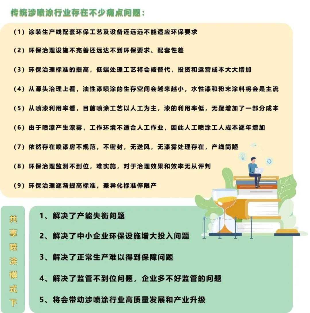 VOCs重點(diǎn)企業(yè)分級管理和清單化管控可以讓同一區(qū)域、同一行業(yè)內(nèi),同等水平的企業(yè)減排要求相對一致,既讓環(huán)保績效水平先進(jìn)的企業(yè)享受政策紅利,也讓持續(xù)提標(biāo)改造的企業(yè)看到希望,從而鼓勵“先進(jìn)”,鞭策“后進(jìn)”,推動行業(yè)治理水平整體升級,促進(jìn)全行業(yè)高質(zhì)量發(fā)展,全面改善環(huán)境空氣質(zhì)量,將有望推動企業(yè)實(shí)施深度治理,實(shí)現(xiàn)更大幅度的VOCs減排,從而提升區(qū)域環(huán)境空氣質(zhì)量水平。 03加強(qiáng)“共享”思維 近年來共享單車、共享汽車、共享充電寶等共享經(jīng)濟(jì)告訴發(fā)展,為社會和群眾都帶來了極大的便利,隨著環(huán)境污染治理的嚴(yán)峻形勢,VOCs治理方面也掀起“共享”浪潮。企業(yè)集中治污,提升治污水平,減少污染排放。以共享噴涂車間為例,已在家具、汽車等行業(yè)中投入使用,初步實(shí)現(xiàn)同類企業(yè)污染物集中處理。代替分散的涂裝工序,實(shí)現(xiàn)集中生產(chǎn)、集中管理、集中治污。
