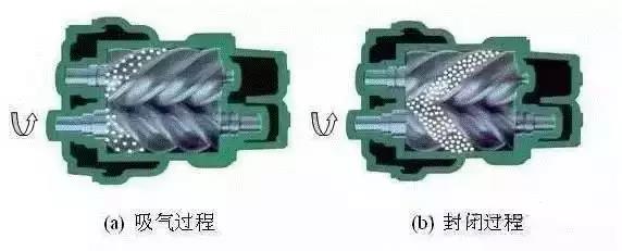 工作循環(huán)可分為吸氣、壓縮和排氣三個(gè)過(guò)程。隨著轉(zhuǎn)子旋轉(zhuǎn),每對(duì)相互嚙合的齒相繼完成相同的工作循環(huán)。 工作原理: 螺桿式壓縮機(jī)汽缸內(nèi)裝有一對(duì)互相嚙合的螺旋形陰陽(yáng)轉(zhuǎn)子,兩轉(zhuǎn)子都有幾個(gè)凹形齒,兩者互相反向旋轉(zhuǎn)。轉(zhuǎn)子之間和機(jī)殼與轉(zhuǎn)子之間的間隙僅為5~10絲,主轉(zhuǎn)子(又稱(chēng)陽(yáng)轉(zhuǎn)子或凸轉(zhuǎn)子),通過(guò)由發(fā)動(dòng)機(jī)或電動(dòng)機(jī)驅(qū)動(dòng)(多數(shù)為電動(dòng)機(jī)驅(qū)動(dòng)),另一轉(zhuǎn)子(又稱(chēng)陰轉(zhuǎn)子或凹轉(zhuǎn)子)是由主轉(zhuǎn)子通過(guò)噴油形成的油膜進(jìn)行驅(qū)動(dòng),或由主轉(zhuǎn)子端和凹轉(zhuǎn)子端的同步齒輪驅(qū)動(dòng)。所以驅(qū)動(dòng)中沒(méi)有金屬接觸(理論上)。轉(zhuǎn)子的長(zhǎng)度和直徑?jīng)Q定壓縮機(jī)排氣量(流量)和排氣壓力,轉(zhuǎn)子越長(zhǎng),壓力越高;轉(zhuǎn)子直徑越大,流量越大。 螺旋轉(zhuǎn)子凹槽經(jīng)過(guò)吸氣口時(shí)充滿(mǎn)氣體。當(dāng)轉(zhuǎn)子旋轉(zhuǎn)時(shí),轉(zhuǎn)子凹槽被機(jī)殼壁封閉,形成壓縮腔室,當(dāng)轉(zhuǎn)子凹槽封閉后,潤(rùn)滑油被噴入壓縮腔室,起密封。冷卻和潤(rùn)滑作用。當(dāng)轉(zhuǎn)子旋轉(zhuǎn)壓縮潤(rùn)滑劑+氣體(簡(jiǎn)稱(chēng)油氣混合物)時(shí),壓縮腔室容積減小,向排氣口壓縮油氣混合物。當(dāng)壓縮腔室經(jīng)過(guò)排氣口時(shí),油氣混合物從壓縮機(jī)排出,完成一個(gè)吸氣→壓縮→排氣過(guò)程。