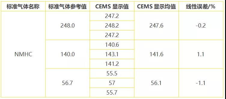 參照《上海市固定污染源非甲烷總烴在線監(jiān)測系統(tǒng)驗收及運行技術要求(試行)》,CEMS監(jiān)測系統(tǒng)在監(jiān)測前使用3種濃度的標準氣體NMHC進行了校準,得到非甲烷總烴線性誤差在-1.1%~1.1%,滿足規(guī)范中質控要求(見表3)。 表3 非甲烷總烴CEMS先是濃度/(mg/m3) 誤差數(shù)據(jù)統(tǒng)計