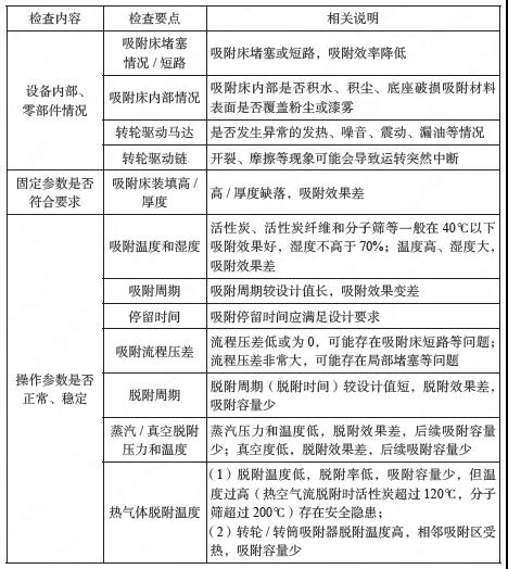 企業(yè)應(yīng)明確有機(jī)廢氣VOCs 治理設(shè)施關(guān)鍵固定參數(shù)設(shè)計(jì)值和正常運(yùn)行時(shí)操作參數(shù)指標(biāo)范圍限值,通過(guò)檢查這類指標(biāo)是否正常且穩(wěn)定,用以判斷設(shè)施是否正常運(yùn)行。VOCs吸附裝置運(yùn)行維護(hù)要求如下,吸附劑目前主要為活性炭、樹脂等。