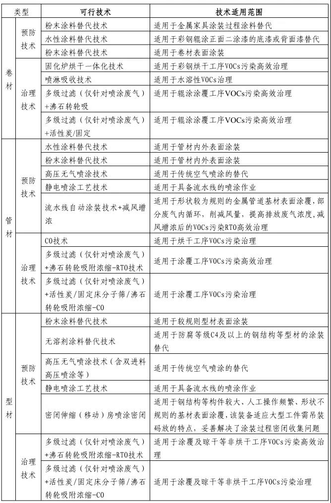 金屬材料生產(chǎn)過程中的VOCs主要來源于金屬表面涂裝工序。涂裝工序一般由涂料調(diào)配、表面預(yù)處理、涂覆、流平、干燥/固化等環(huán)節(jié)組成,常見的涂覆作業(yè)方式包括噴涂、輥涂、粉末涂裝等類別,常見的干燥/固化方式包括自然晾干、烘干、輻射固化等。涂裝過程VOCs主要來源于涂料、稀釋劑、固化劑、清洗劑等原輔材料中的有機溶劑組分揮發(fā)。 三、污染預(yù)防技術(shù) 1.原輔料替代技術(shù) (1)水性涂料替代技術(shù) 適用于底面或不易接觸室外環(huán)境材料金屬涂料的替代,常見的水性涂料包括水性環(huán)氧漆、水性丙烯酸漆、水性聚氨酯漆等。采用水性涂料替代溶劑型涂料,VOCs產(chǎn)生量一般可減少80%以上。 (2)粉末噴涂替代技術(shù) 適用于鋼管、鋼結(jié)構(gòu)等領(lǐng)域涂料替代。使用高壓靜電把粉末涂料沉積附著到基板上涂裝,粉末涂料的噴涂過程VOCs產(chǎn)生量很少。 (3)無溶劑涂料替代技術(shù) 適用于鋼結(jié)構(gòu)等領(lǐng)域涂料替代腐蝕等級為C4、C5和CX的環(huán)境。 2.設(shè)備或工藝革新技術(shù) (1)高壓無氣噴涂技術(shù) 高壓無氣噴涂技術(shù)適用于傳統(tǒng)空氣噴涂的替代。使用高壓柱塞泵,直接將油漆加壓,形成高壓力的油漆,噴出槍口形成霧化氣流作用于基材。與傳統(tǒng)的空氣噴涂相比,高壓無氣噴涂提高了涂料利用率,可降低涂料使用量,從源頭減少VOCs排放。 (2)靜電噴涂技術(shù) 靜電噴涂技術(shù)適用于金屬材料表面的涂裝,且要求涂料電阻率較低。靜電噴涂是指利用電暈放電原理使霧化涂料在高壓直流電場作用下荷負電,并吸附于荷正電基底表面放電的涂裝方法。靜電噴涂設(shè)備由噴槍、噴杯以及靜電噴涂高壓電源等組成。靜電噴涂的涂料利用率可達到80%以上,涂料使用量顯著減少。 (3)流水線自動涂裝技術(shù) 流水線自動涂裝適用于金屬管道等形狀較為規(guī)則的基材表面涂覆,涂裝方式可采用噴涂、輥涂等。自動化涂裝線的涂料利用率高,且有利于VOCs收集治理,無組織排放較少。涂裝過程自動化后可實現(xiàn)部分廢氣內(nèi)循環(huán),達到“減風(fēng)增濃”的效果。 (4)密閉伸縮(移動)房噴涂密閉技術(shù) 密閉伸縮(移動)房噴涂密閉技術(shù)適用于鋼結(jié)構(gòu)等構(gòu)件較大、人工操作頻繁、形狀不規(guī)則的基材表面涂覆,該裝備適應(yīng)大型工件需吊裝碼放的特點,妥善解決了涂裝過程密閉問題,有利于VOCs精準收集,大幅削減了涂裝廢氣量。 四、無組織排放控制措施 涂料、稀釋劑、固化劑、清洗劑等VOCs物料密閉儲存。盛裝VOCs物料的容器或包裝袋應(yīng)密閉儲存于室內(nèi),或存放于設(shè)置有雨棚、遮陽和防滲設(shè)施的專用場地。盛裝VOCs物料的容器或包裝袋在非取用狀態(tài)時應(yīng)加蓋、封口,保持封閉。 含VOCs廢料(渣、液)以及VOCs物料廢包裝物等危險廢物密封儲存于危廢儲存間。廢涂料、廢稀釋劑、廢清洗劑、廢漆渣、廢活性炭等含VOCs廢料(渣、液)以及VOCs物料廢包裝物等危險廢物密封儲存于危廢貯存場所。涂料、稀釋劑、固化劑等VOCs物料的調(diào)配過程應(yīng)采用密閉設(shè)備或在密閉空間內(nèi)操作,并設(shè)臵專門的密閉調(diào)配間,調(diào)配廢氣應(yīng)排至VOCs廢氣收集處理系統(tǒng);無法密閉的,應(yīng)采取局部氣體收集措施,廢氣應(yīng)排至VOCs廢氣收集處理系統(tǒng)。 含VOCs物料轉(zhuǎn)運和輸送應(yīng)采用密閉管道或密閉容器等,涂料使用量大的企業(yè)宜采用集中供料系統(tǒng),彩鋼板、管道等穩(wěn)定流水線涂裝作業(yè)宜采用用集中供料系統(tǒng)。無集中供料系統(tǒng)的輥涂等作業(yè)應(yīng)采用密閉的泵送供料系統(tǒng)及涂料回流系統(tǒng)。涂裝作業(yè)結(jié)束應(yīng)將剩余的所有涂料及含VOCs的輔料送回調(diào)配間或儲存間。 所有涂裝作業(yè)應(yīng)在設(shè)置VOCs收集系統(tǒng)的密閉空間內(nèi)進行。 五、污染防治可行技術(shù) 從污染預(yù)防技術(shù)和治理技術(shù)出發(fā),指南列出了常見的可行技術(shù)及相應(yīng)的適用條件。
