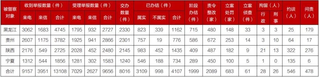 經黨中央、國務院批準,第二輪第五批4個中央生態(tài)環(huán)境保護督察組于2021年12月3日至5日陸續(xù)進駐黑龍江、貴州、陜西、寧夏4個?。▍^(qū))開展督察。截至2022年1月5日晚20:00,全面完成督察進駐工作。 各督察組在進駐期間深入貫徹習近平生態(tài)文明思想,認真落實黨的十九屆六中全會精神,立足新發(fā)展階段,貫徹新發(fā)展理念,構建新發(fā)展格局,推動高質量發(fā)展,堅持服務大局,堅持系統(tǒng)觀念,堅持嚴的基調,堅持問題導向,堅持精準科學依法督察,嚴格執(zhí)行《中央生態(tài)環(huán)境保護督察工作規(guī)定》。始終堅持以人民為中心,結合黨史學習教育,把推動解決群眾反映突出的生態(tài)環(huán)境問題作為“我為群眾辦實事”的重要內容和督察工作的重中之重,抽查回訪群眾舉報問題的整改落實情況,與人民群眾面對面交流,聽取意見建議,得到人民群眾的肯定和稱贊。始終堅持動真碰硬,深入基層、深入一線、深入現(xiàn)場,查實一批盲目上馬“兩高”項目、生態(tài)破壞嚴重、環(huán)境基礎設施建設滯后、違法排污等突出生態(tài)環(huán)境問題,核實一批不作為、慢作為,不擔當、不碰硬,甚至敷衍應對、弄虛作假等形式主義、官僚主義問題,截至1月5日,已曝光典型案例12個。始終堅持實事求是,務求督察實效,堅決反對生態(tài)環(huán)境保護“一刀切”和問責泛化、簡單化以及以問責代替整改等問題,不斷改進和優(yōu)化督察流程方法,努力減輕基層負擔。 有關?。▍^(qū))高度重視督察工作,將督察作為堅決貫徹習近平生態(tài)文明思想的重要內容,作為推動高質量發(fā)展的重要契機,主要領導通過督察動員、現(xiàn)場督辦、召開專題會議等方式,大力推動整改落實。截至目前,各督察組共收到群眾來電、來信舉報13108件,受理有效舉報9656件,經梳理合并重復舉報,累計向相關?。▍^(qū))轉辦8016件。相關省(區(qū))已辦結或階段辦結6106件。其中,立案處罰683家,立案偵查61件,拘留54人;約談黨政領導干部546人,問責黨政領導干部478人。 各督察組堅決貫徹落實中央決策部署,統(tǒng)籌做好經濟平穩(wěn)運行、民生保障、常態(tài)化疫情防控和生態(tài)環(huán)境保護,明確督察方向,把握工作節(jié)奏,突出工作重點,努力發(fā)現(xiàn)問題,推動解決問題。有關?。▍^(qū))在解決群眾信訪問題中,既認真查處、堅決整改,也實事求是、分類施策,做到精準科學依法,積極服務“六穩(wěn)”“六保”。 對已經轉辦、待查處整改的群眾舉報問題,各督察組均已安排人員繼續(xù)督辦,確保群眾舉報問題能夠查處到位、整改到位、公開到位。 第二輪第五批中央生態(tài)環(huán)境保護督察 邊督邊改情況匯總表