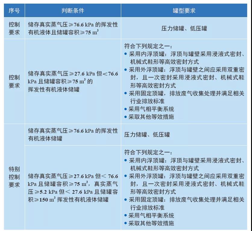 有機(jī)液體需根據(jù)真實(shí)蒸氣壓等化學(xué)品參數(shù)及儲(chǔ)罐容積選擇合適的罐型。如環(huán)保監(jiān)管單位需要現(xiàn)場(chǎng)檢查,則需根據(jù)企業(yè)環(huán)評(píng)、排污許可證副本、行業(yè)標(biāo)準(zhǔn)等資料判斷儲(chǔ)罐類型與物料是否匹配。有行業(yè)標(biāo)準(zhǔn)的(如制藥工業(yè),涂料、油墨及膠粘劑工業(yè)等),照行業(yè)標(biāo)準(zhǔn)判斷,無(wú)行業(yè)標(biāo)準(zhǔn)的,根據(jù)《揮發(fā)性有機(jī)物無(wú)組織排放控制標(biāo)準(zhǔn)》(GB37822—2019)要求,其中,對(duì)廢氣及處理措施的有無(wú)有如下要求: