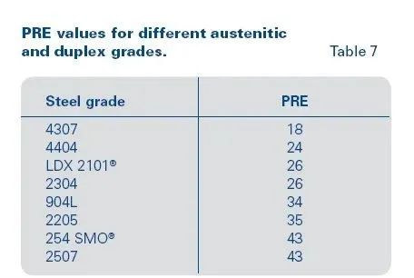 3、雙相鋼耐氯離子腐蝕怎么樣? 有人會問,雙相鋼耐氯離子腐蝕怎樣?性能如何? 下圖為PRE耐腐蝕當(dāng)量值,耐點腐蝕指數(shù) PRE (PittingResistance Equivalent) 數(shù)值反映的是材料的耐氯離子點腐蝕傾向。 從下圖可以看出,雙相鋼2101、2304、2205、2507四個牌號耐腐蝕傾向均大于普通316L,有些材料和超級不銹鋼相當(dāng)。 如2507耐點腐蝕就媲美254SMO,2205與904L的耐氯離子點腐蝕腐蝕性能相當(dāng)。 代入上面第2部分,很清楚可以看到他們排在什么位置。