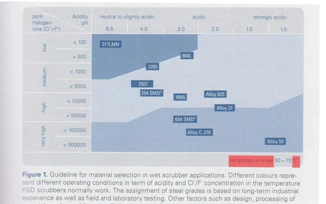 上面黑白圖和藍色圖一樣,是來自奧托昆普不同年份和版本的圖示,可以看出: 316L耐氯離子點腐蝕性能遠低于254SMO,耐縫隙腐蝕結(jié)果同樣。 如60度溫度時候,316L僅耐200ppm不到,904L耐8500ppm,254SMO耐15000ppm氯離子。 數(shù)值大家可以按圖索驥。 5、FGD脫硫氯離子+氟離子腐蝕選材(55~70度)