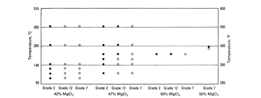 可以看出,在該工況中,鈦鈀合金和鈦鎳鉬合金耐氯離子的程度比純鈦高的多! 耐腐蝕度: Grade 7 > Grade 12 > 純鈦(Grade 2) 注意:圖中白色圓圈代表可以使用;黑色圓圈代表容易發(fā)生縫隙腐蝕或點蝕;白色三角形代表發(fā)生輕微的縫隙腐蝕,但是不影響使用。 文章來源:壓力容器設(shè)計院,VOCs減排工作站