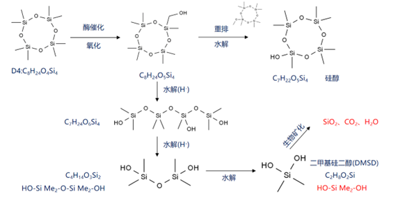 結(jié)合對硅油行業(yè)的廢氣成分進(jìn)行分析,處理的難點(diǎn)主要在于硅氧烷的治理,通過相關(guān)文獻(xiàn)調(diào)研,發(fā)現(xiàn)生物法是有機(jī)硅行業(yè)廢氣處理的解決方法之一。 在文獻(xiàn)“硅氧烷在環(huán)境中的遷移轉(zhuǎn)化及其對生物氣應(yīng)用的影響(環(huán)境科學(xué)學(xué)報(bào).35(10):3050-3056)中報(bào)道:在環(huán)境中,厭氧產(chǎn)甲烷、硫酸還原、硝酸鹽還原、好氧代謝等微生物化學(xué)過程均可能使聚硅氧烷發(fā)解聚/分解反應(yīng),轉(zhuǎn)化為揮發(fā)能力較強(qiáng)的小分子硅氧烷.這些小分子揮發(fā)性硅氧烷可以進(jìn)一步被生物降解,形成中間水解產(chǎn)物,一般為二甲基烷醇(Dimethylsilanediol,DMSD).二甲基烷醇可以被進(jìn)一步生物降解 ,礦化成SiO2、CO2和H2O。以D4為例,微生物對其降解的代謝途徑如下:
