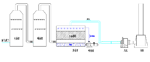 同時(shí)已有國內(nèi)科研團(tuán)隊(duì)證明,在DMC底物濃度為200 mg/L的情況下,72h生物降解后的濃度為14.68mg/L,降解效率在92.66%,由此可見,微生物降解硅氧烷的技術(shù)空間是較為巨大的,故此應(yīng)用在實(shí)際過程中,微生物法技術(shù)應(yīng)用在硅油行業(yè)廢氣治理是可行的,需選擇具針對性和定制性的微生物菌種和運(yùn)行工藝,有望便于達(dá)到預(yù)期的處理效果。 五、案例分析 某有機(jī)硅企業(yè)實(shí)際生物法治理VOCs廢氣工程案例:該企業(yè)主要生產(chǎn)有機(jī)硅高級產(chǎn)品,其生產(chǎn)波動較大,廢氣濃度范圍在500-1000 mg/m³,廢氣主要來源為:真空泵區(qū)域、儲罐區(qū)域,處理風(fēng)量為10000 m³/h。主要的污染物為:異丙醇、三甲胺、硅氧烷、甲醇、二甲苯等。處理工藝流程如下: