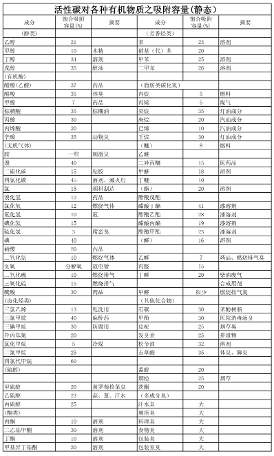 前幾日,常熟生態(tài)環(huán)境發(fā)布“致全市揮發(fā)性有機(jī)物排放企業(yè)負(fù)責(zé)人的一封信”,近期不少市局也以這種方式再次通告轄區(qū)內(nèi)VOCs治理的統(tǒng)一要求。文中提及“一次性活性炭吸附廢氣處理設(shè)施必須使用柱狀炭(顆粒炭),碘吸附值不低于800毫克/克,并按設(shè)計要求足量填充、及時更換”。吸附VOCs的活性炭其實CTC值是更具有表征意義,碘值是其次。此外,活性炭對各類VOCs物質(zhì)的吸附容量,也是計算活性炭更換周期或判斷其吸附效果的重要參數(shù)之一,下面分享活性炭對各類VOCs的吸附容量數(shù)值,如下: