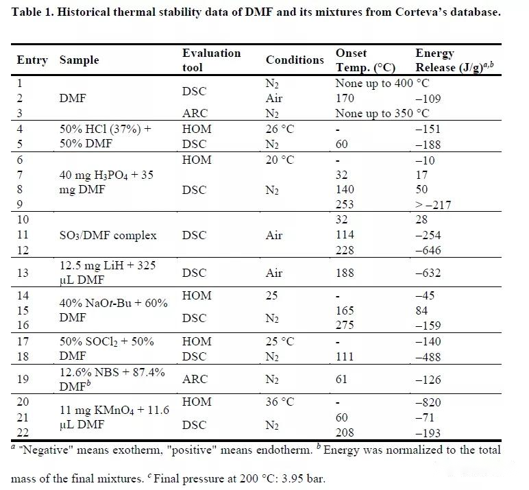 一、DMF的不穩(wěn)定性 純DMF 是沒(méi)有氣味的,但工業(yè)級(jí)或變質(zhì)的二甲基甲酰胺則有魚(yú)腥味,因其含有二甲基胺類的雜質(zhì)。純的DMF在室溫下很穩(wěn)定,但是加熱至其沸點(diǎn)(153℃)會(huì)緩慢分解。在氮?dú)夥諊逻M(jìn)行DSC和ARC分析,一直到350℃其狀態(tài)穩(wěn)定,未見(jiàn)其分解;但是在空氣條件下,170℃即開(kāi)始發(fā)生分解反應(yīng)溫度不同,分解產(chǎn)物也不一樣,一般的分解產(chǎn)物為:三甲胺,甲胺,一氧化碳,二氧化碳,氫氣等。