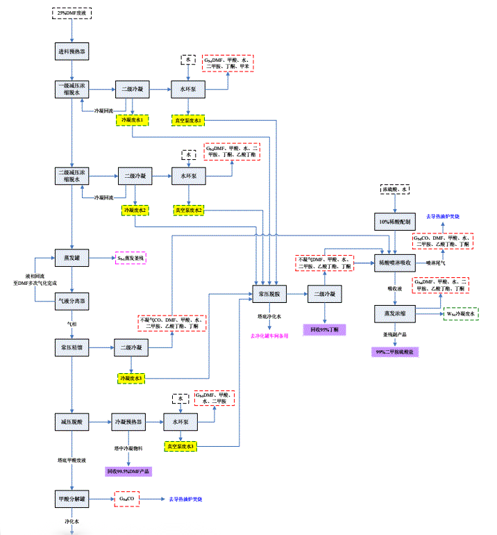 致使分解或產(chǎn)生危險(xiǎn)的因素: 1. DMF在空氣中和加熱至沸時(shí)均很穩(wěn)定,當(dāng)溫度高于350℃時(shí)即失水,生成一氧化碳和二甲胺。 2. 在酸,特別是強(qiáng)酸存在下DMF的水解可能是有害的,因?yàn)樗猱a(chǎn)物HCOOH可以進(jìn)一步分解釋放不可冷凝的氣體,如CO,CO2和氫(H2)等 3. 在強(qiáng)堿如氫氧化鉀(KOH),氫氧化鈉(NaOH)或氫化鈣(CaH2)存在下在環(huán)境溫度下長(zhǎng)時(shí)間靜置,則純DMF明顯分解。在強(qiáng)堿存在下DMF的分解釋放的Me2NH已被用作Me2NH的原位來(lái)源以實(shí)現(xiàn)各種化學(xué)轉(zhuǎn)化。 4. 其他的在DMF溶劑中的具有潛在危險(xiǎn)的試劑還有:鹽酸,硫酸,磷酸;氫化鋰,氫化鈉,氫化鈣,醇鉀,氯氣,溴水,高錳酸鉀,高氯酸;硼氫化鈉,硼烷等。 二、DMF傳統(tǒng)回收工藝 綜上所述,可知DMF本身的理化性質(zhì)可直接導(dǎo)致回收及處理均須謹(jǐn)慎考慮。傳統(tǒng)DMF回收工藝采用:過(guò)濾、預(yù)熱、二級(jí)減壓濃縮除水、常壓精餾、減壓脫酸、常壓脫胺(五塔三效工藝),可回收得到純度99%的DMF。