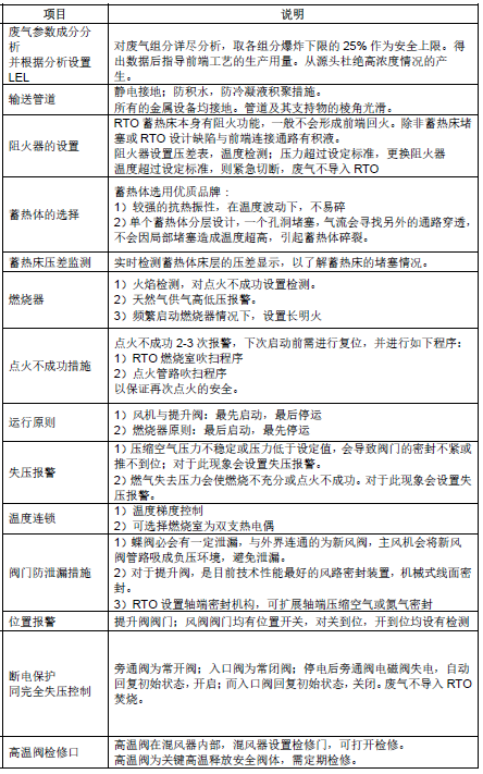 眾所周知,RTO催化燃燒系統(tǒng)中的LEL是非常關(guān)鍵的安全措施。一般而言可燃氣體濃度分析儀 LEL 安裝在 RTO 催化燃燒入口前100 米以外總管上(考慮 LEL 的響應(yīng)時間+閥門動作的時間),反饋信號與旁通閥及 RTO 新風閥形成邏輯回路,規(guī)避 RTO 焚燒廢氣的超高濃度風險。常規(guī)的控制如下,設(shè)置兩道LEL:LEL 測得爆炸下限 15%(可調(diào)整設(shè)定)左右,則進行預(yù)警,RTO 催化燃燒處新風閥都打開;LEL 測得濃度為爆炸下限 22%(可調(diào)整設(shè)定)左右,則打開 RTO 催化燃燒旁通閥,關(guān)閉 RTO 催化燃燒入口閥,打開 RTO催化燃燒 新風閥,廢氣旁通不進入 RTO 焚燒。下面我們再來看看RTO催化燃燒系統(tǒng)中,特別是精細化工VOCs廢氣RTO催化燃燒系統(tǒng)中的一些安全措施清單及考慮。如下:
