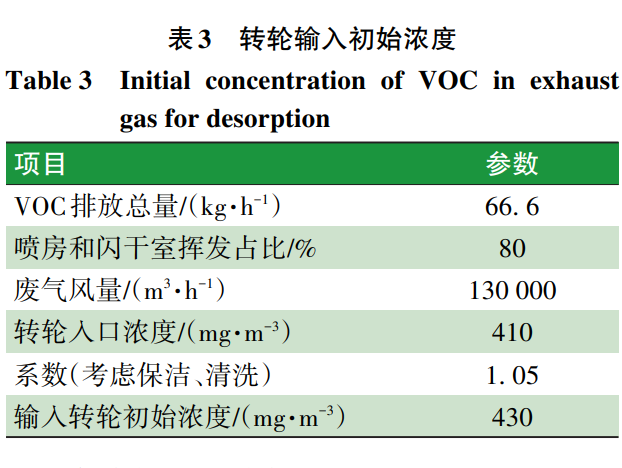 從表3看出,噴房與閃干室混合廢氣輸入轉(zhuǎn)輪前的初始VOC濃度為430mg/m³,但轉(zhuǎn)輪對(duì)于進(jìn)入的廢氣有溫度要求,一般要求溫度≤40℃,溫度過(guò)高會(huì)影響轉(zhuǎn)輪的吸附效率。因此需要核算混合廢氣的溫濕度,以便確定閃干室廢氣的去向。 2.1閃干室廢氣去向 需要核算閃干室與噴房廢氣混合后的溫度能否滿足轉(zhuǎn)輪入口溫度要求。仍以該公司駕駛室線為例,閃干室廢氣溫度為80℃,與色漆、清漆噴房廢氣混合后溫度見(jiàn)表4。