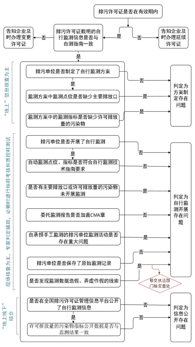 1.檢查要點(diǎn) 排污許可證載明的自行監(jiān)測(cè)信息與排污單位自行監(jiān)測(cè)技術(shù)指南的一致性; 自行監(jiān)測(cè)方案制定的規(guī)范性和完整性; 自行監(jiān)測(cè)開(kāi)展的規(guī)范性和全面性; 自行監(jiān)測(cè)信息公開(kāi)的及時(shí)性、完整性和一致性。 2.檢查流程