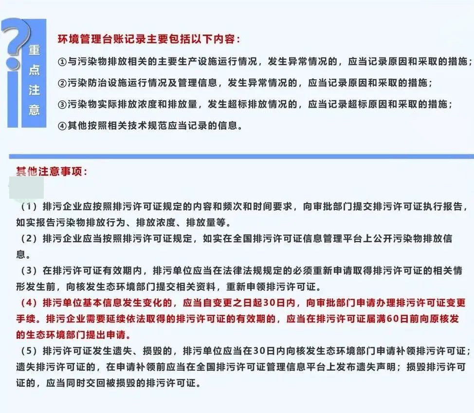 生態(tài)環(huán)境部4月份印發(fā)的《“十四五”環(huán)境影響評(píng)價(jià)與排污許可工作實(shí)施方案》的主要目標(biāo)提出,排污許可核心制度進(jìn)一步穩(wěn)固,其中,排污許可“一證式”管理全面落實(shí)。未來(lái)企業(yè)排污許可方面面臨哪些監(jiān)管? 環(huán)境管理要素全覆蓋,工業(yè)固體依法納入排污許可管理相關(guān)工作,強(qiáng)化排污許可證中工業(yè)固體廢物的填報(bào)質(zhì)量;或?qū)⑼苿?dòng)將工業(yè)噪聲納入排污許可證等;排污許可證內(nèi)容與環(huán)境質(zhì)量改善要求掛鉤,深化部分重點(diǎn)行業(yè)排污許可技術(shù)規(guī)范的制修訂研究工作,探索污染物許可排放量與環(huán)境質(zhì)量掛鉤的計(jì)算方法;強(qiáng)信息化建設(shè),優(yōu)化完善排污許可平臺(tái)與移動(dòng)執(zhí)法、自行監(jiān)測(cè)等平臺(tái)系統(tǒng)的銜接,推動(dòng)監(jiān)管執(zhí)法精準(zhǔn)化、高效化,實(shí)現(xiàn)數(shù)據(jù)互通。運(yùn)用大數(shù)據(jù)、人工智能、區(qū)塊鏈等新技術(shù)手段,推動(dòng)排污許可數(shù)據(jù)應(yīng)用。 實(shí)現(xiàn)排污許可“一證式”監(jiān)管,是固定污染源執(zhí)法監(jiān)管體系的核心,推行排污許可“一證式”管理,將排污許可作為企業(yè)合法生產(chǎn)的“身份證”,是全面提升生態(tài)環(huán)境治理現(xiàn)代化水平的必然要求。 03排污許可領(lǐng)取后續(xù)工作都有哪些? 生態(tài)環(huán)境部“一證式”管理全面落實(shí)體現(xiàn)了國(guó)家對(duì)于排污許可證管理工作的重視,企業(yè)領(lǐng)取排污許可證后需要做些什么? 1、核對(duì)排污許可證信息。排污單位在取得排污許可證后,首先要對(duì)排污許可證上所記載的內(nèi)容與系統(tǒng)填報(bào)內(nèi)容進(jìn)行認(rèn)真比對(duì),逐一核實(shí)排污許可證所載內(nèi)容與環(huán)評(píng)文件、企業(yè)現(xiàn)場(chǎng)、技術(shù)規(guī)范等是否一致,是否存在漏填、錯(cuò)填現(xiàn)象。特別提醒委托他人進(jìn)行填報(bào)的排污單位,務(wù)必逐項(xiàng)認(rèn)真核實(shí),確保排污許可證與企業(yè)實(shí)際情況是否一致。 2、依證排污、按證監(jiān)測(cè)。排污單位應(yīng)根據(jù)排污許可證(副本)中的“第六項(xiàng) 環(huán)境管理要求(一)自行監(jiān)測(cè)”或“全國(guó)排污許可證管理信息平臺(tái) 公開(kāi)端”申報(bào)內(nèi)容 “環(huán)境管理要求-自行監(jiān)測(cè)要求”中確定的監(jiān)測(cè)內(nèi)容、監(jiān)測(cè)因子、監(jiān)測(cè)方式、監(jiān)測(cè)頻次等要求開(kāi)展自行監(jiān)測(cè)。 3、做好臺(tái)賬記錄。排污單位按照排污許可證規(guī)定的格式、內(nèi)容和頻次,如實(shí)記錄環(huán)境管理臺(tái)賬,保存期限不得少于5年,超過(guò)5年的記錄應(yīng)當(dāng)掃描轉(zhuǎn)為電子存檔。應(yīng)根據(jù)排污許可證中臺(tái)賬記錄要求的記錄信息進(jìn)行記錄。記錄形式為電子臺(tái)賬和紙質(zhì)臺(tái)賬。保存期限不少于3年,監(jiān)測(cè)記錄信息保存不少于5年(危險(xiǎn)廢物經(jīng)營(yíng)單位應(yīng)當(dāng)將臺(tái)賬記錄保存10年以上,以填埋方式處置危險(xiǎn)廢物的臺(tái)賬記錄應(yīng)當(dāng)永久保存)。