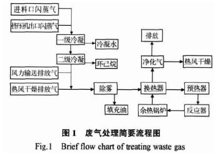 產(chǎn)品風(fēng)力輸送排放氣、熱風(fēng)干燥排放氣直接進(jìn)行催化燃燒處理,進(jìn)料口閃蒸氣、擠壓機(jī)出口閃蒸氣中含有大量的水蒸汽和環(huán)己烷對(duì)這兩股廢氣首先采用兩級(jí)冷凝預(yù)處理,以回收其中的水和環(huán)己烷,兩級(jí)冷凝得到的不凝氣與風(fēng)力輸送排放氣、熱風(fēng)干燥排放氣混和,一并進(jìn)行催化燃燒處理?;旌蜌庖来谓?jīng)過(guò)除霧器、催化風(fēng)機(jī)、換熱器冷、加熱器、催化燃燒反應(yīng)器、換熱器等處理后,回收能量,凈化氣達(dá)標(biāo)排放。