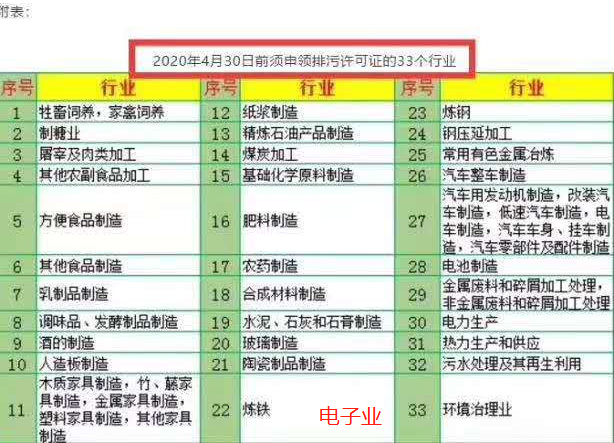 若屬附表33個(gè)行業(yè)的現(xiàn)有排污單位如仍未取得排污許可證,須于2020年4月30日前申請(qǐng)并取得排污許可證或完成排污登記。附表之外的排污單位,應(yīng)于2020年9月30日前申請(qǐng)并取導(dǎo)排污許可證或完成排污登記。