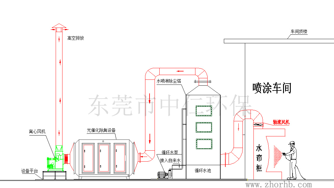 噴漆廢氣處理工程(水噴淋+紫外光光催化除臭設(shè)備工工藝圖)