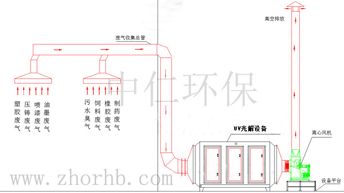 有機(jī)廢氣氣體利用排風(fēng)設(shè)備輸入到ZR系列UV紫外光光催化除臭設(shè)備后,凈化設(shè)備運(yùn)用高能UV紫外線光束及臭氧對惡臭氣體進(jìn)行協(xié)同分解氧化反應(yīng),使惡臭氣體物質(zhì)其降解化成低分子化合物、水和二氧化碳,再通過排風(fēng)管道排出室外。