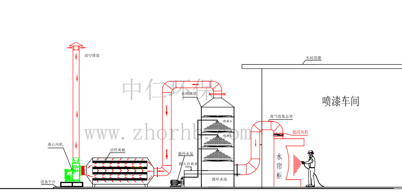 噴漆廢氣經(jīng)水噴淋預處理后+活性炭吸附高空排放